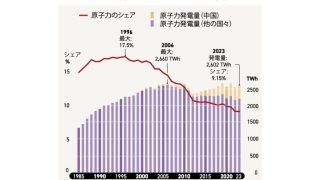 国際原子力機関(IAEA)の原子炉情報システム(PRIS)によると、2025年2月現在世界で417基の原発が稼働しています。この数には、定期点検により停止している炉等も含まれています。図は1985年から2023年の世界の原子力による発電量と...